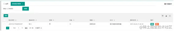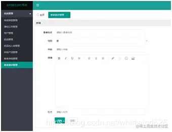 如图3.19所示,点击患者就诊管理,选择添加,跳转到新增处方界面,医生输入患者的姓名、性别、年龄、病情以及相对应的处方,点击保存,保存成功后,患者就诊记录就会显示刚刚新建的处方,方便日后查找,必要的时候可以导出打印。