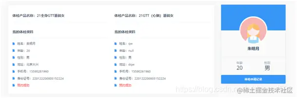 如图3.11所示,提交申请体检信息后,返回个人信息处,查看体检申请记录,就会显示刚才预约体检的项目信息,显示预约成功。