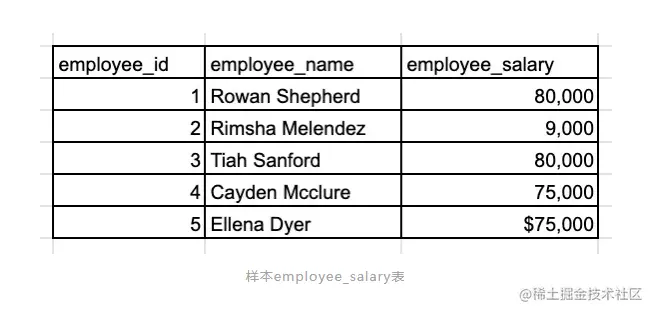 这里你应该要求面试官说清楚“前三名”具体是什么意思。我应该在结果中包括 3 名员工吗?你要我怎样处理关系?此外,请仔细检查样本员工数据。salary 字段的数据类型是什么?在计算之前是否需要清除数据?
