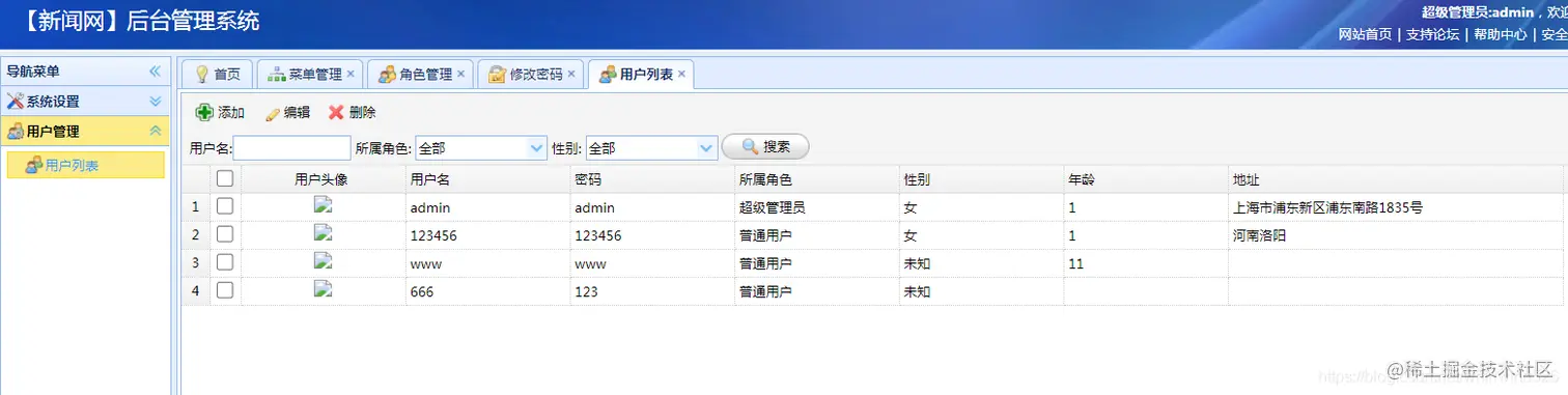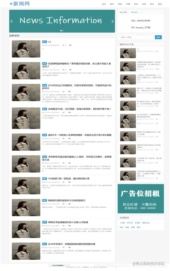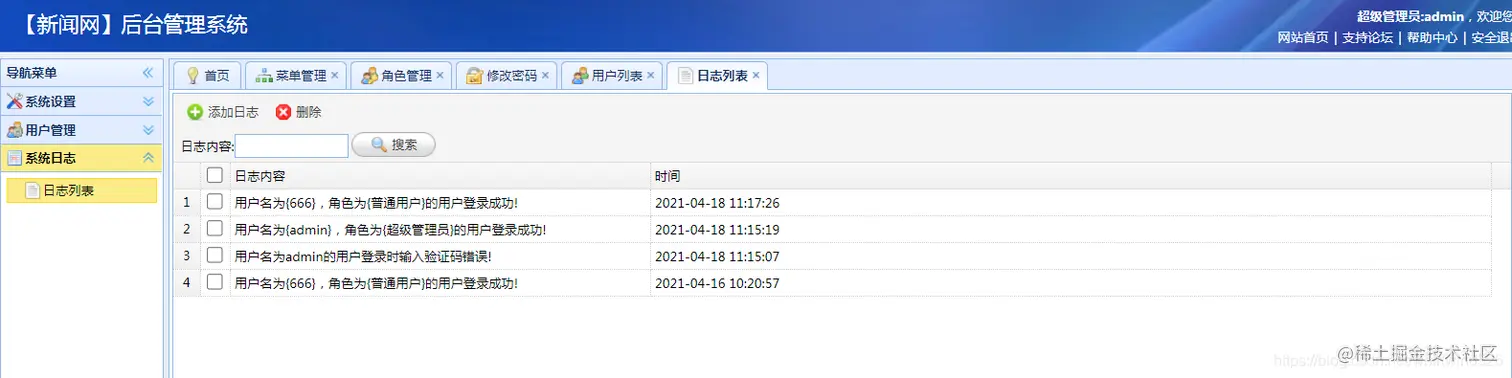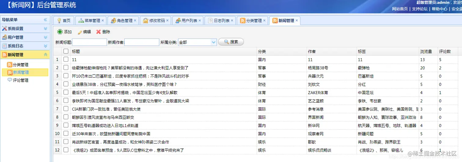 以上是展示的部分系统功能,普通用户注册后可以登陆系统进行新闻的查看和评论,也可以添加后台普通管理用户,用于发布新闻等操作。系统结构清晰,功能完整,界面简洁大方,适合做毕业设计使用。