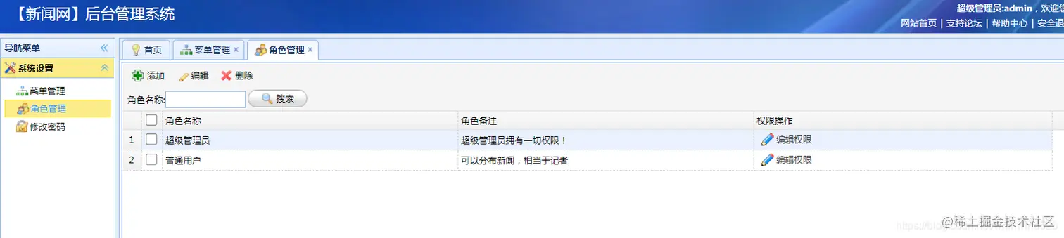 本系统基于 SSM 框架开发实现了一个新闻发布和管理系统,前端主要使用 easyUi+jquery 开发实现。系统功能完整,界而简洁大方,自带完善的权限管理系统,可以根据系统需要自由灵活的设置相关人员的权限。下面来展示一下新闻发布系统的相关功能。