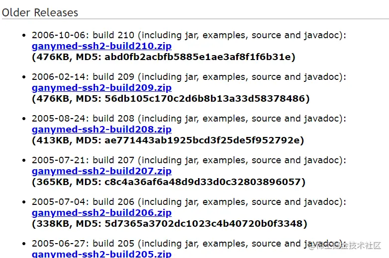 官方地址:Ganymed SSH-2 for Java,打开页面后,如下图位置,选择一个版本下载,我以最后发布版本说明,从图中也可以看到最后一次发版是在2006年,很老的一个库了。