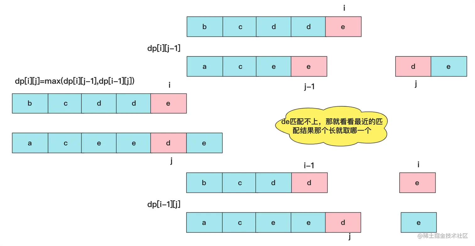 如果text1[i]!=text2[j],就有两种可能性,我们知道的邻居有dp[i-1][j],dp[i][j-1],很多人还会想到dp[i-1][j-1]这个一定比前两个小于等于,因为就是前面两个子范围嘛!所以这时就相当于末尾匹配不成,就要看看邻居能匹配的最大值啦,此时dp[i][j]=max(dp[i][j-1],dp[i-1][j])。