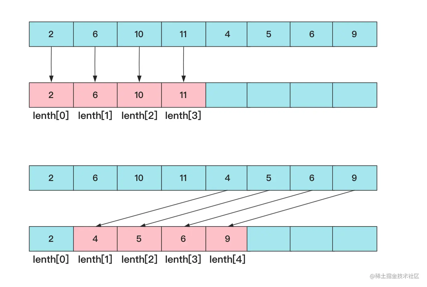 例如 2,3,9,5…… 在前面最长的长度为3 我们愿意抛弃2,3,9 而全部使用2,3,5 。也就是对于一个值,我们希望这个值能更新以它为结尾的最长的序列的末尾值。