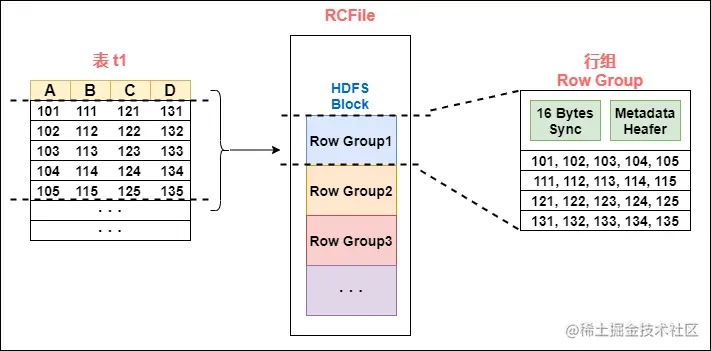 注:RCFile 和 ORCFile 并不是纯粹的列式存储,它是先基于行对数据表进行分组(行组),然后对行组进行列式存储