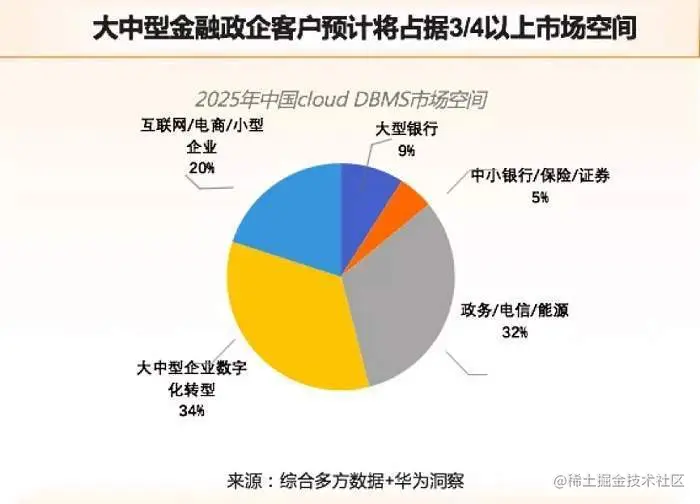 华为预测,大中型金融政企客户在云数据库方面的支出会占到整个中国云数据库市场的3/4,其中OLTP类型数据库市场空间为60%,OLAP为23%,NoSQL为17%。