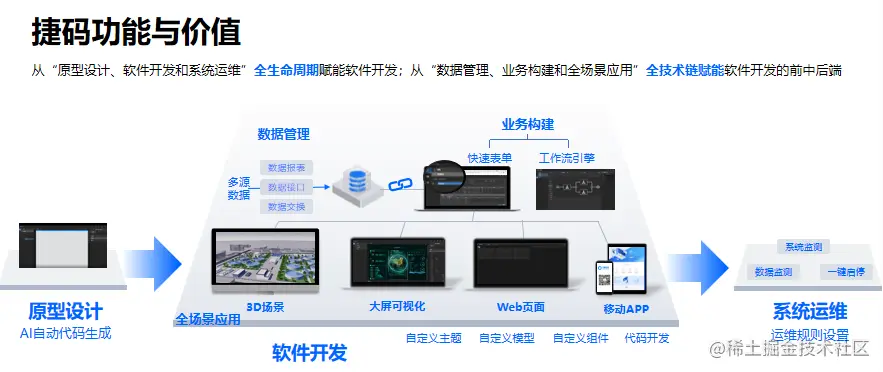 首先,低代码的黑盒子是在开发者熟悉的技术栈上运行,而这些技术栈本身和低代码类似,也经历了被逐步认识、喜爱、鄙视并再次喜爱上的过程。比如“捷码”低代码开发平台,就贯通了软件开发的前端、后端和系统运维等开发过程的全技术链,也全面支持WEB、APP、小程序、3D可视化、大屏可视化等方向的开发实现,设计前台完全使用JavaScript,数据库方面兼容SQLite、SQL Server、MySQL等主流数据库。这些完整的技术栈确保开发者不需要在不同的平台之间切换,无需担心不同平台的兼容性障碍,更保障了低代码开发平台自身的稳定性和可靠性。而且,重要的是,平台的编程接口也基于这些技术,所以,开发者可以将现有的服务器代码、SQL视图及存储过程、样式表等添加到使用低代码开发的项目中。这么看来,你对低代码的稳定性、扩展性等担心,是不是有些多余了呢?