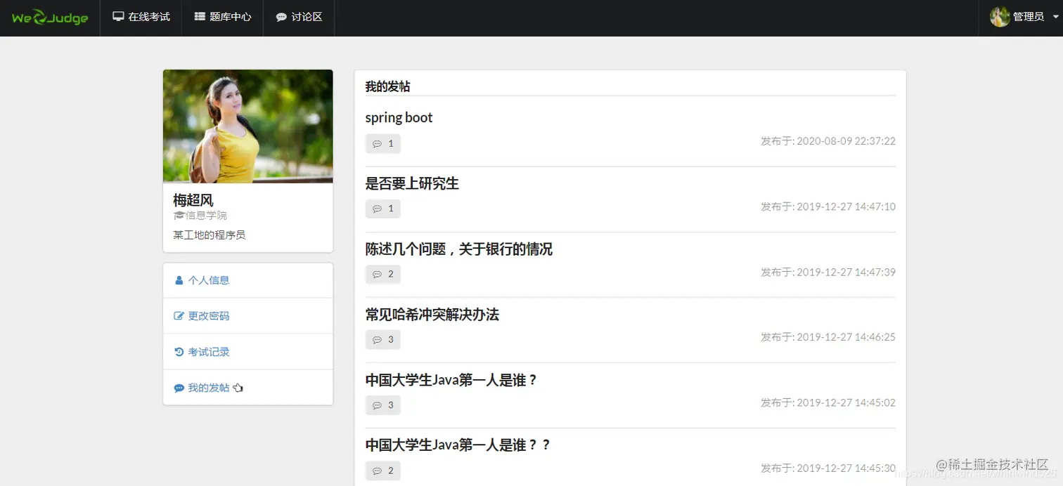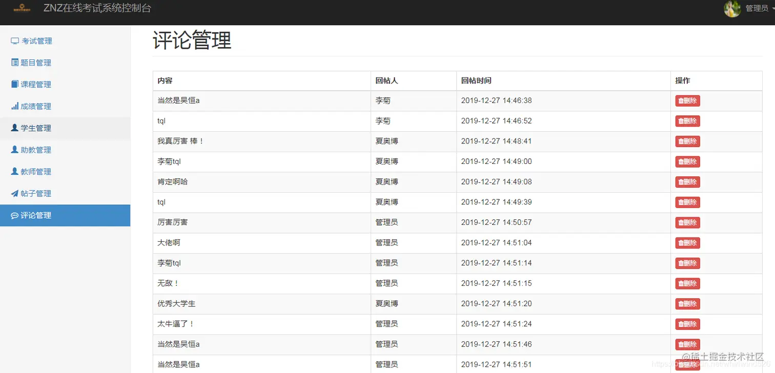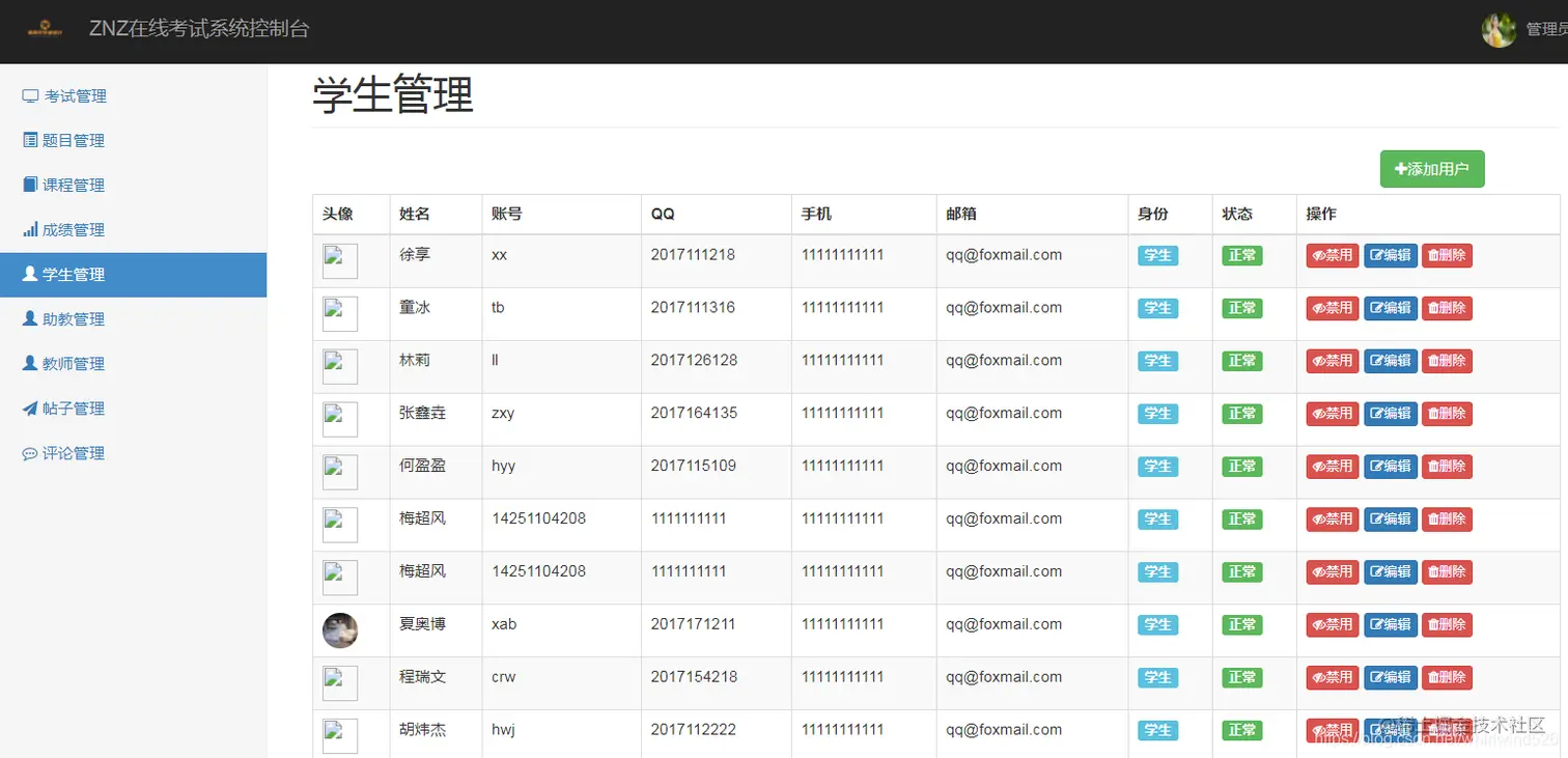 管理员:可以管理学生信息、教师信息、考试信息、课程信息、成绩信息、讨论区的贴子及回贴管理