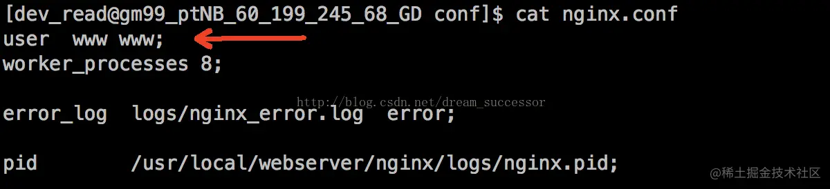 我们可以看到Nginx的配置文件nginix.conf里面划分的运行权限就是配置到了www用户下,因此Nginx的子进程也是由www用户执行,可以通过ps aux | grep nginx来查看: