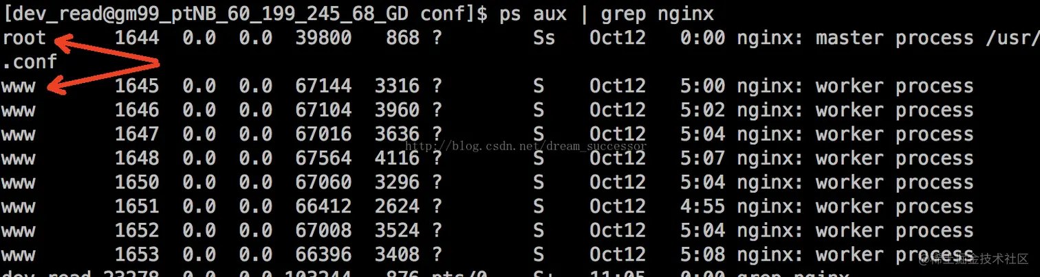 可以看到nginx的主进程是root,其余子进程均是www的用户