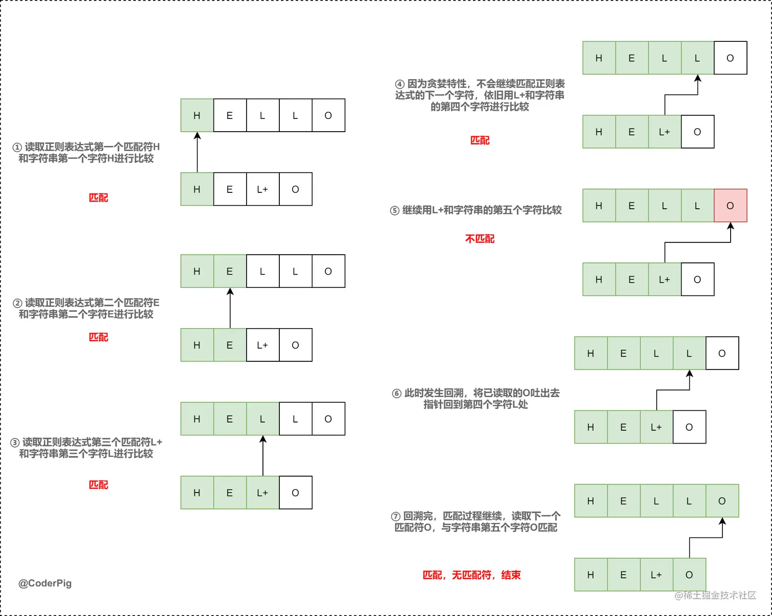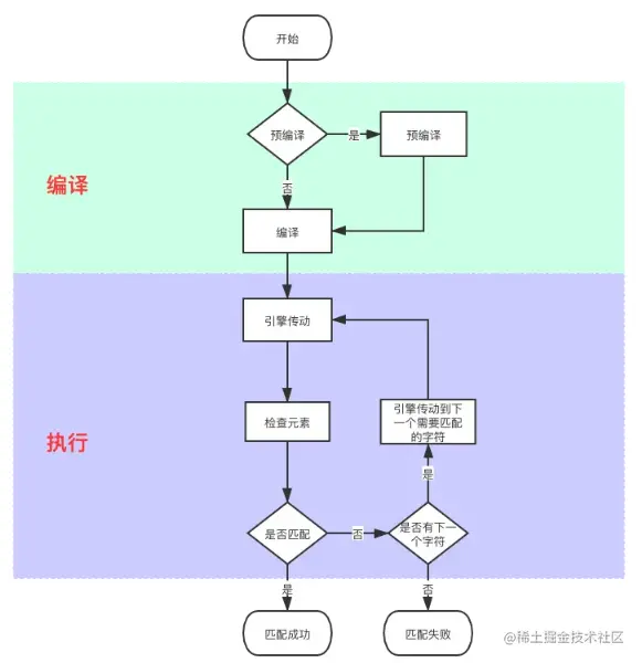 - 表达式主导 → 按照表达式的一部分执行,不匹配换其他部分继续匹配,直到表达式匹配完成;