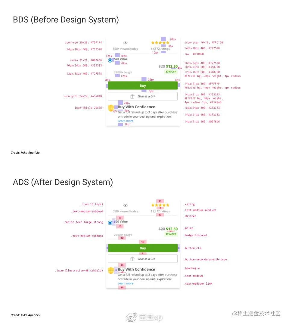 不仅如此,以前设计人员在向开发提供设计稿时,仅仅提供设计上的颜色尺寸等信息,但现在的设计稿,会对相关的组件和属性,都附带有到设计系统网站的链接,让开发可以清楚的知道在实现时,可以直接使用哪些设计系统的组件,以及该如何设置属性。