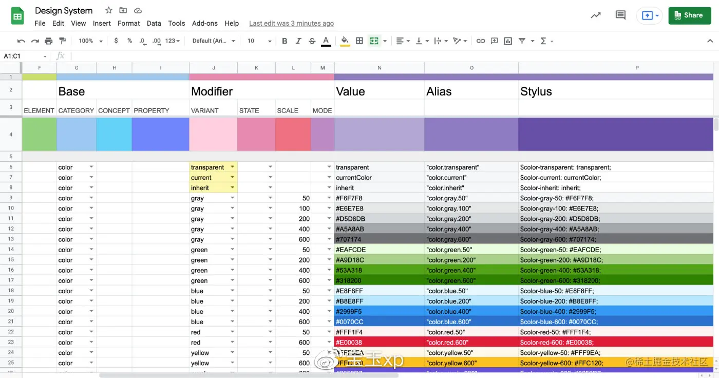 我们所有的Design Tokens,由设计部门用一个Google Spreadsheet管理和维护。如下图所示:
