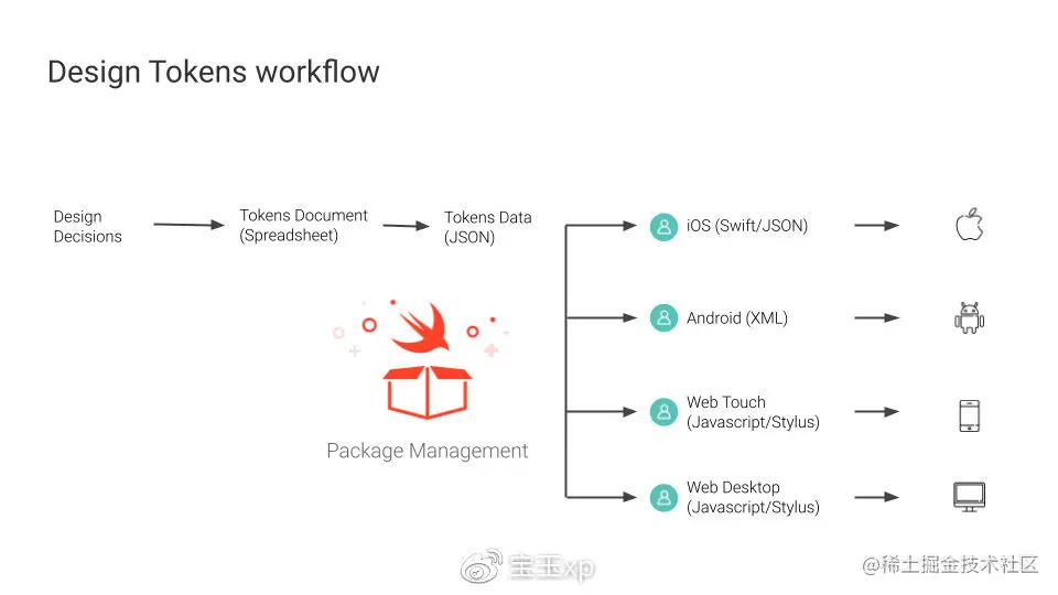 当设计部门对Design Tokens有任何更新,会通知开发团队,开发团队会通过自动化脚本,将Spreadsheet的内容导出,并解析成标准的Json格式,然后针对不同的应用平台生成不同的格式,最后以PR的形式提交到Git上,当PR通过审核和自动化测试后,CI/CD帮助将更新后的内容自动发布新的版本。