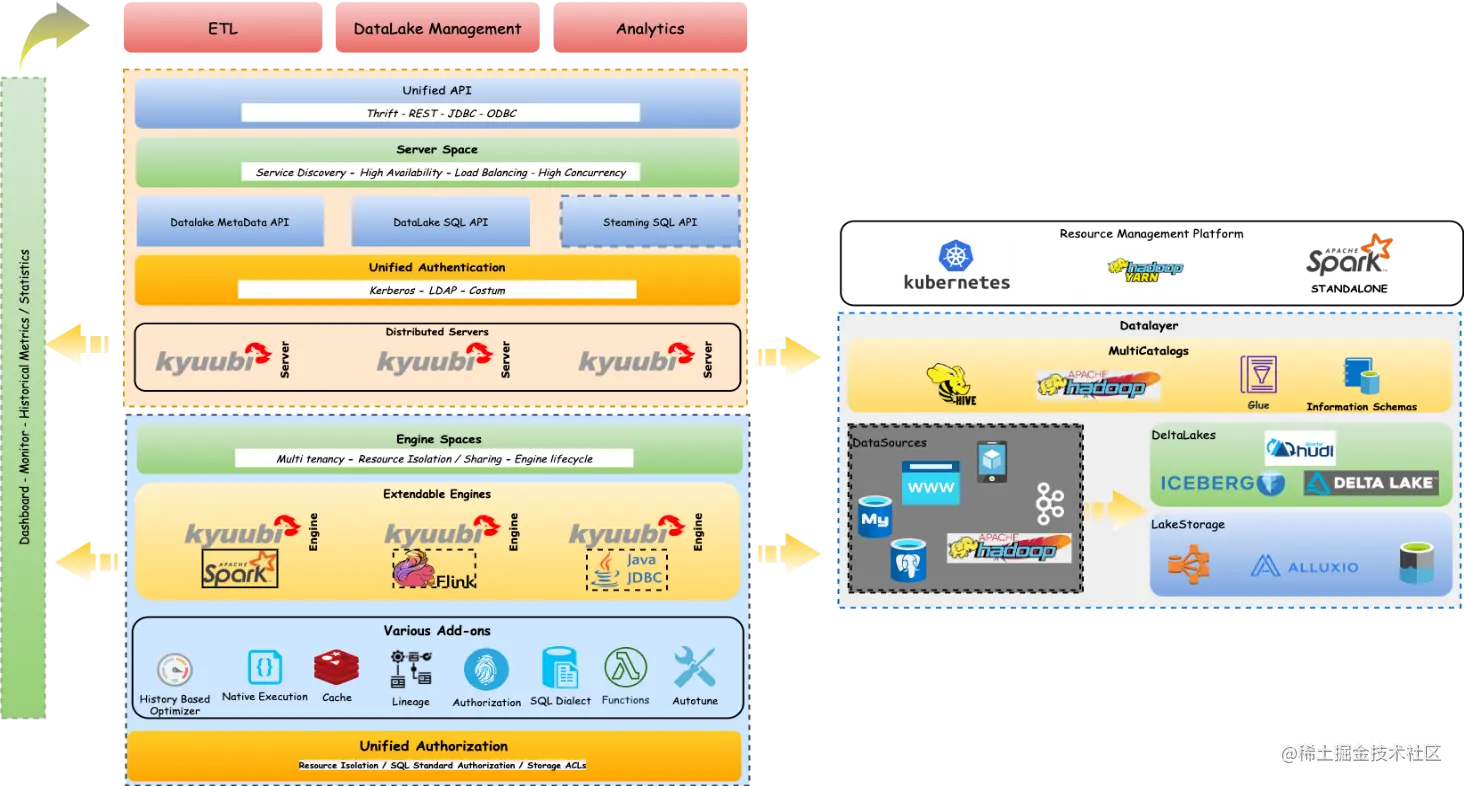 Apache Kyuubi 是一个 Thrift JDBC/ODBC 服务,对接了 Spark 引擎,支持多租户和分布式的特性,可以满足企业内诸如 ETL、BI 报表等多种大数据场景的应用。Kyuubi 可以为企业级数据湖探索提供标准化的接口,赋予用户调动整个数据湖生态的数据的能力,使得用户能够像处理普通数据一样处理大数据。项目已于2021年 6 月 21 号正式进入 Apache 孵化器。于T3出行而言,Kyuubi 的角色是一个面向 Serverless SQL on Lakehouse 的服务。