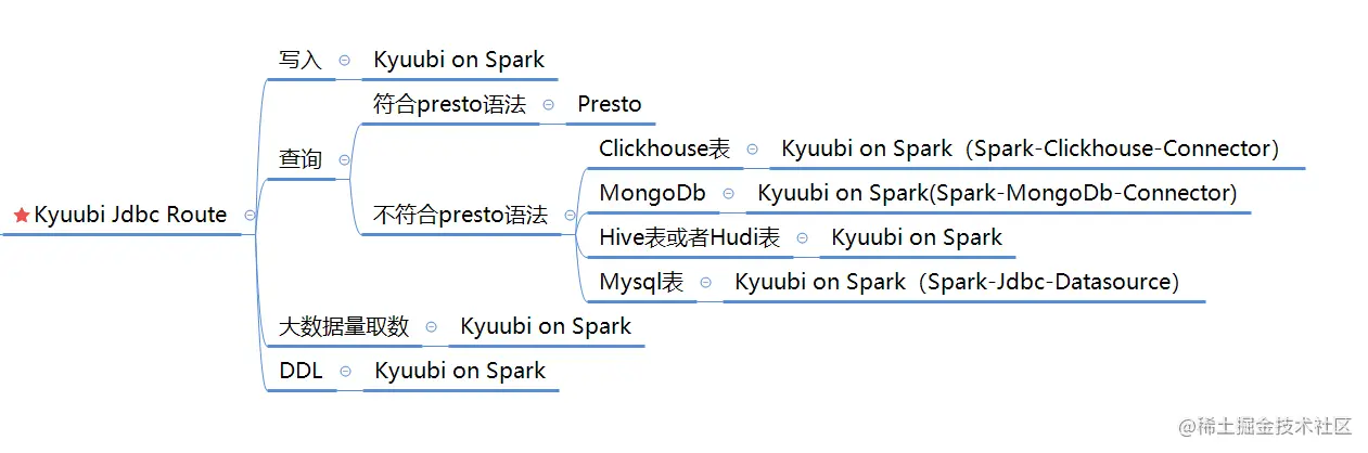 - Kyuubi Router:路由模块,可以将专有语法的 SQL 请求转发到不同的原生 JDBC 服务上。
