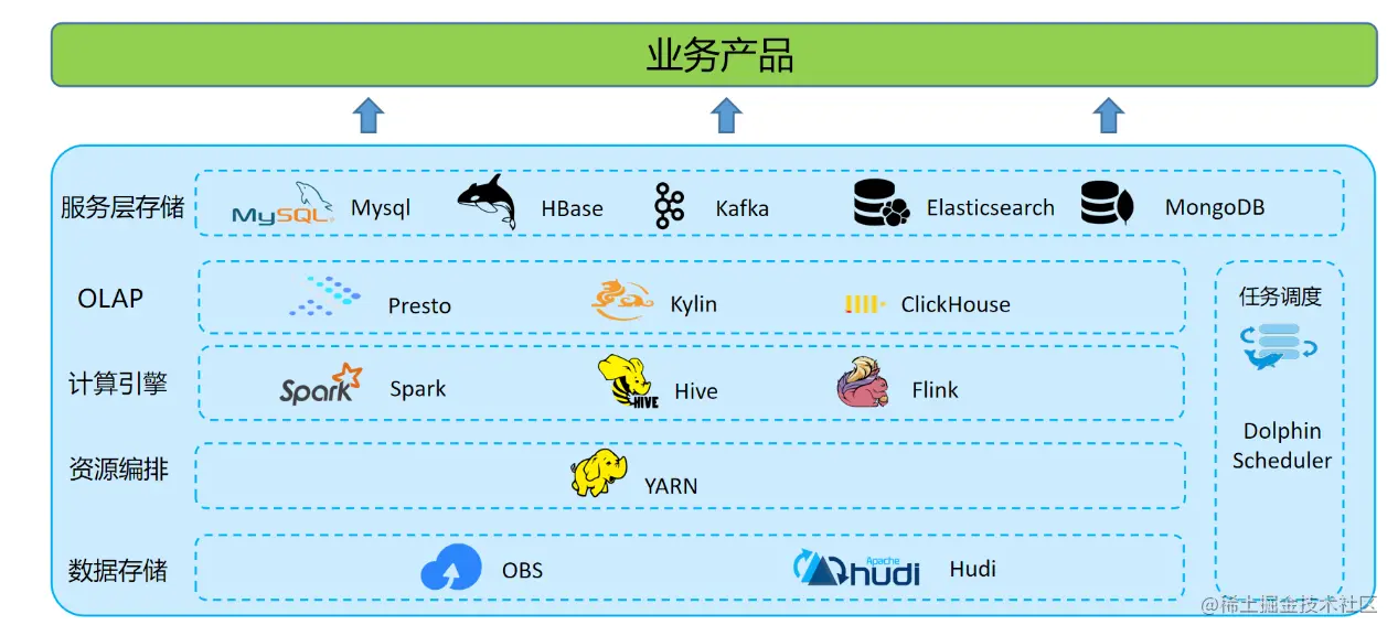 OLAP 层主要为面向管理和运营人员的报表,对接报表平台,查询要求低时延响应,需求多变快速响应。面向数据分析师的即席查询,更是要求 OLAP 引擎能支持复杂 SQL 处理、从海量数据中快速甄选数据的能力。