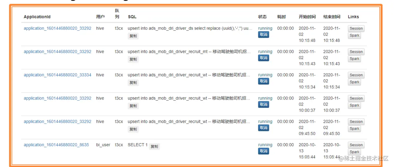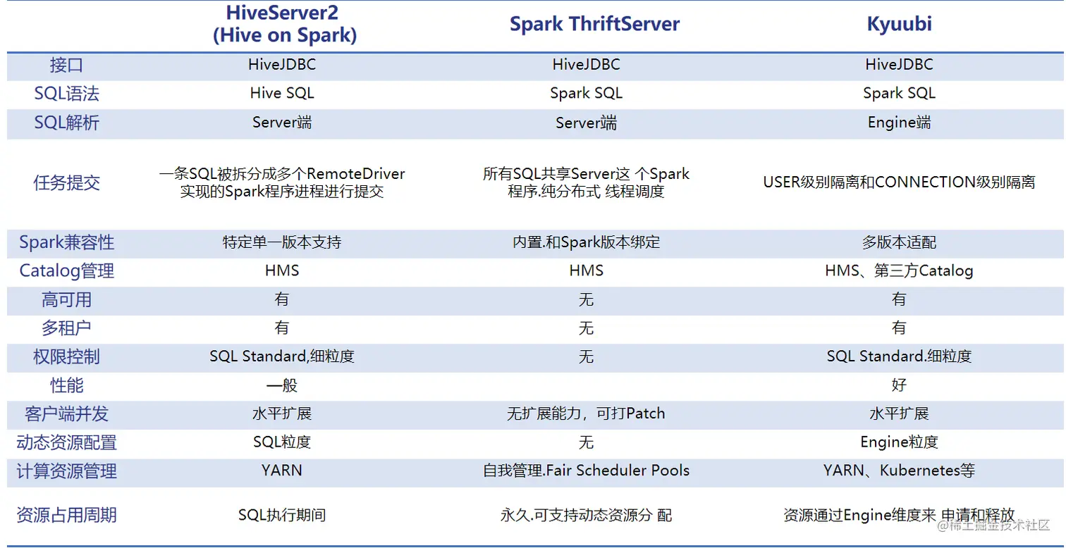 Hive on Spark、Spark ThriftServer 没有较好的资源隔离方案,无法根据租户权限做并发控制。