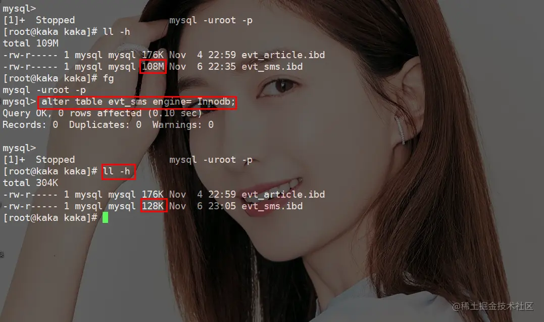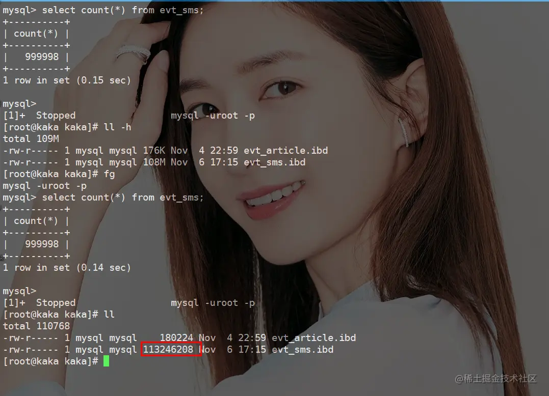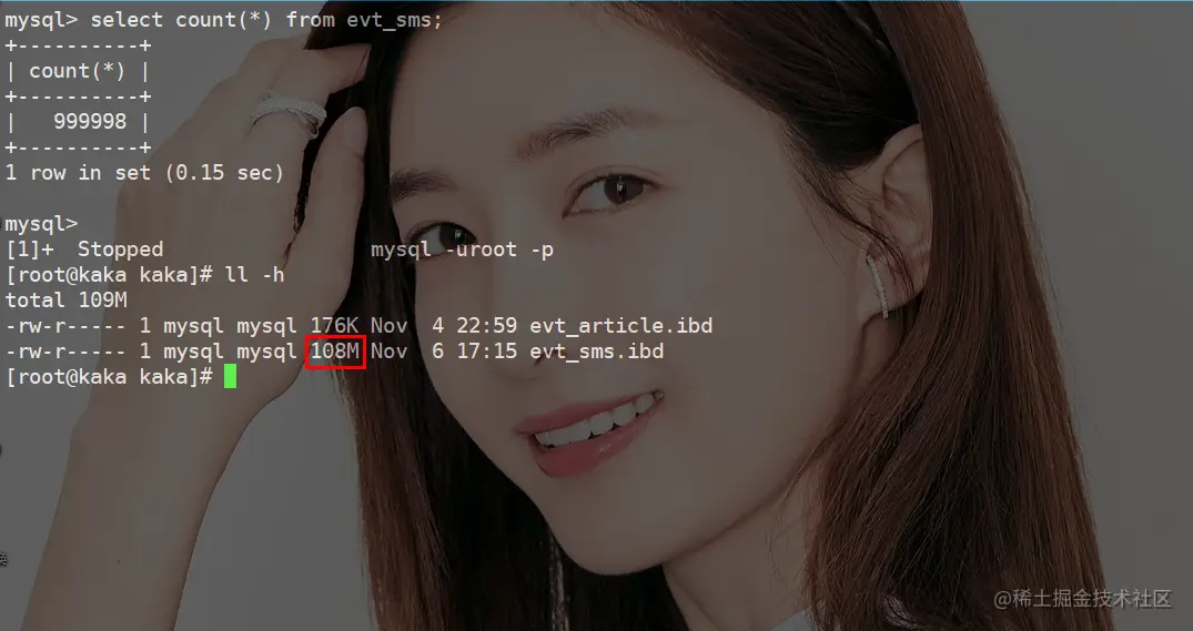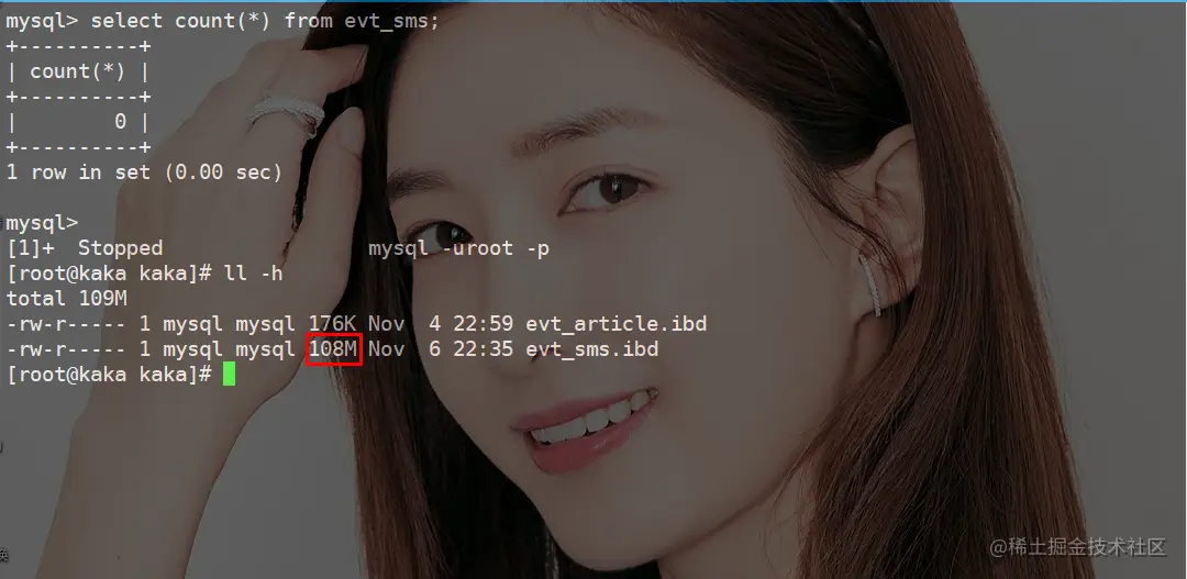 ll -h查看此时表evt_sms磁盘文件大小为108M - 执行