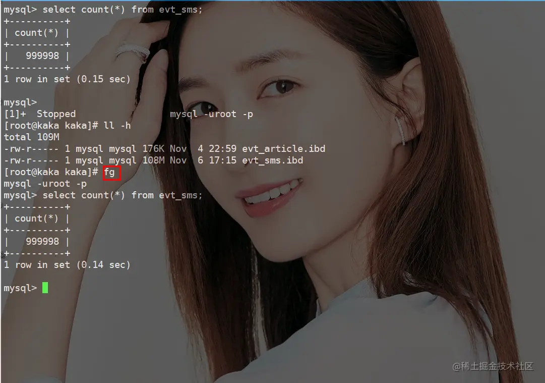 这里大家应该能看见stopped,就是执行命令ctrl + z来的,作用是开始我们在MySQL窗口里边,但不想退出MySQL窗口查看MySQL表文件大小,然后就可以执行这个命令结束任务。