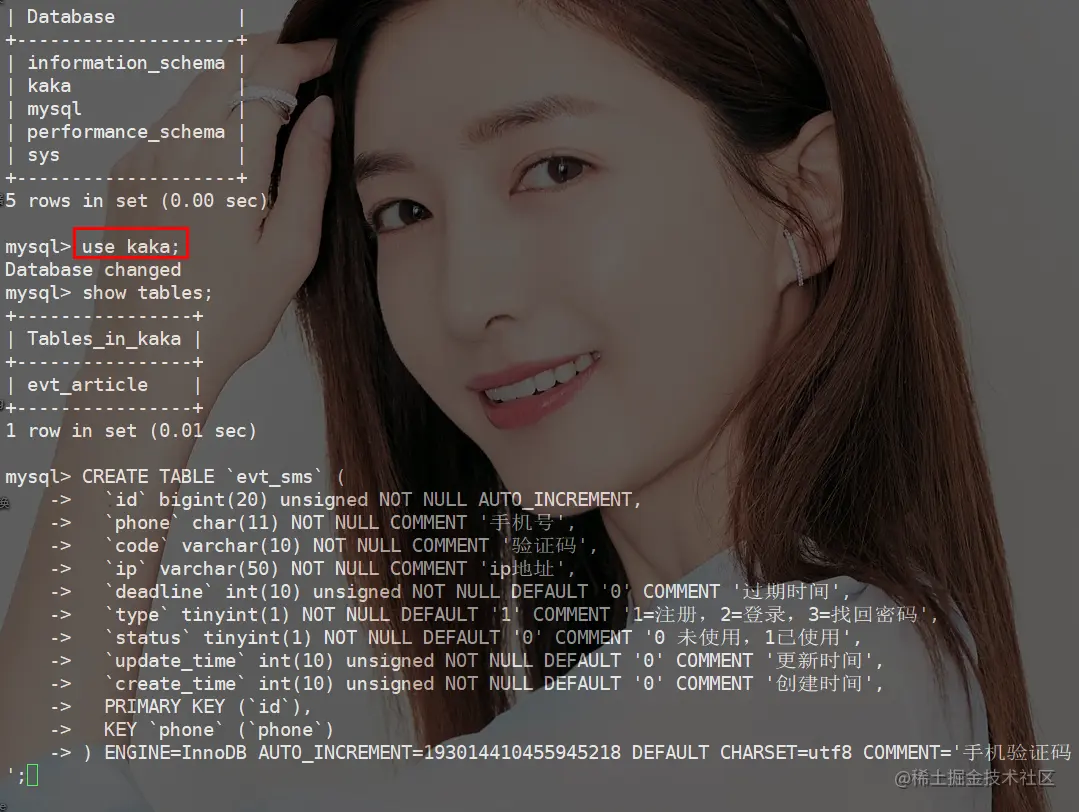 来到死磕MySQL系列的专用数据库kaka,新建一张表evt_sms。