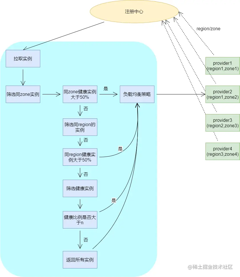 - consumer启动时也调用服务获取自身所在的zone和region