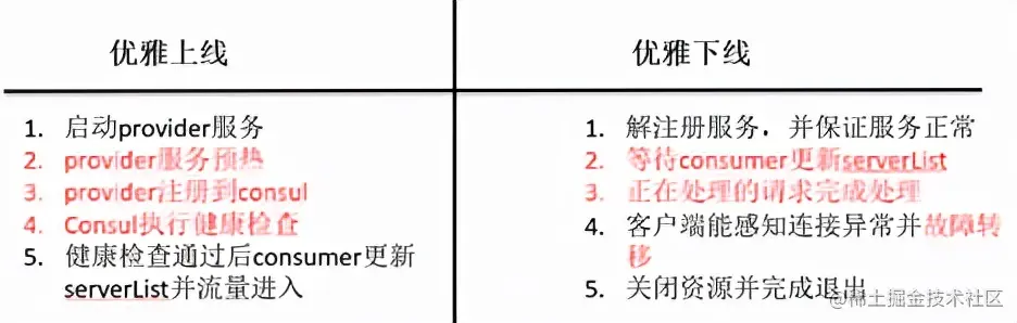 在Spring Cloud的体系中,使用consul、ribbon等组件下,总结下优雅上下线就是:
