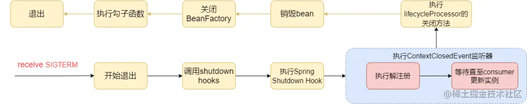 针对SpringCloud现有架构,我们在SpringBoot退出过程中,增加自定义逻辑,保证服务下线过程中严格按照上面的流程。