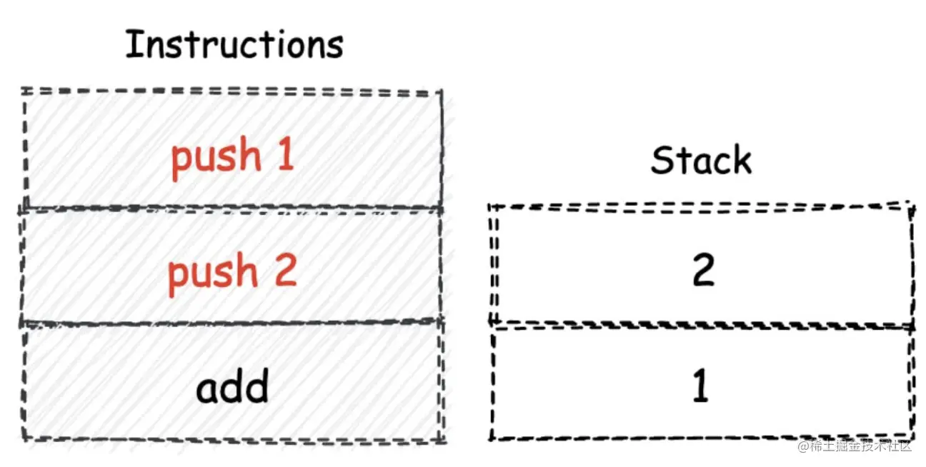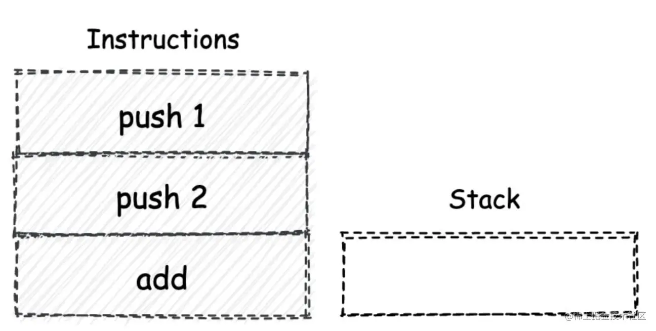 通常来说,对于可以应用在诸如 i386、X86-64 等实际存在的物理系统架构上的指令集,我们一般称之为 ISA(Instruction Set Architecture,指令集架构)。而对另外一种使用在虚拟架构体系中的指令集,我们通常称之为 V-ISA,也就是 Virtual的 ISA。对这些 V-ISA 的设计,大多都是基于堆栈机模型进行的。而 Wasm 就是这样的一种 V-ISA。