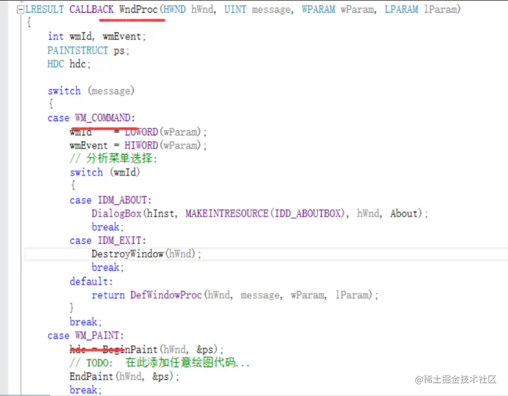 首先来看WndProc函数。具体实现就是通过一个case来进行消息响应的