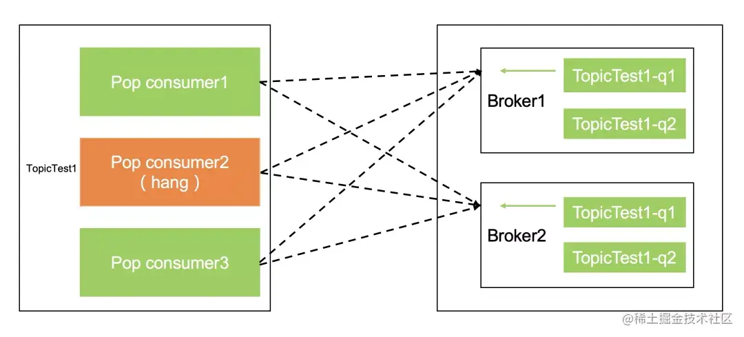 三个客户端并不需要 Rebalance 去分配 Queue,取而代之的是,它们都会使用 POP 请求所有的 Broker 获取消息进行消费。即使 POP Consumer 2 出现 hang,其内部消息也会让 POP Consumer1 和 POP Consumer3 进行消费。这样就解决了 hang 机器可能造成的消费堆积问题。