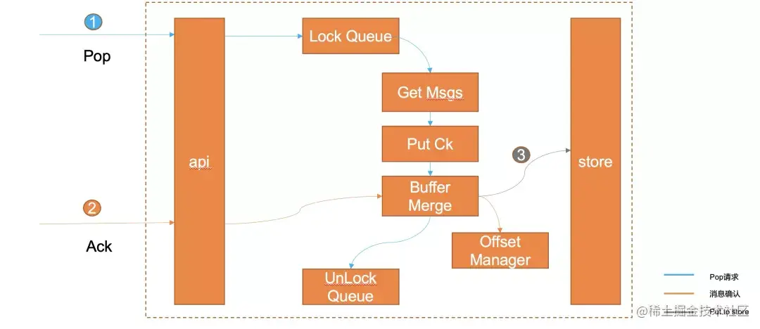 POP Consumer 拉取消息后,会在 Queue 维度上加锁,保证同一时刻只有一个客户端可以拉去到同一个 Queue 的消息。获取到消息后,会保存 checkPoint 信息在 Broker,checkPoint 信息主要包括消息的 Topic,ConsumerGroup,QueueId,offset,POPTime,msgCout,reviveQueueId 等信息。checkPoint 信息会优先保存到 buffer 当中,等待 ack 消息,在一段时间内收到客户端回复的 ack 消息,对应的 checkPoint 信息从 buffer 中移除,并且更新消费进度,标识消息消费成功。