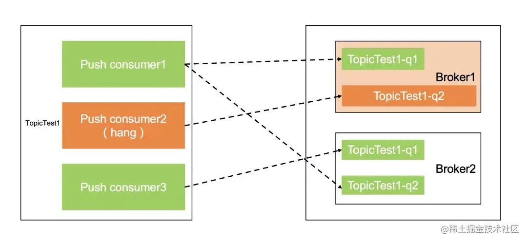 当 Push Consumer 2 机器发生 hang 的时候,它所分配到的 Broker 上的 Q2 出现严重的堆积。我们目前处理这种问题,一般可能是找到这台机器重启,或者下线。保证业务不受异常机器影响,但是如果队列挤压到一定程度可能机器恢复了也没办法快速追赶消费进度,这也是受 Push Consumer 的能力限制。