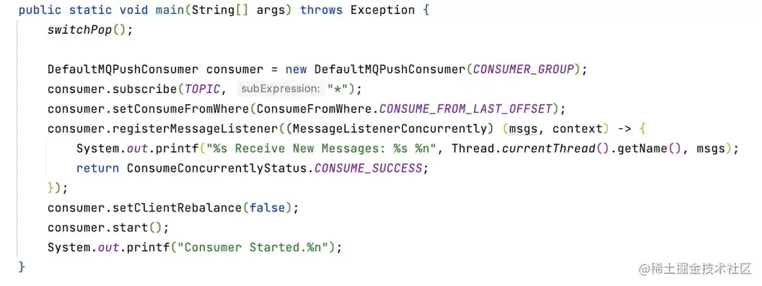 通过下面 POP Consumer Demo,我们看到 POP Consumer 跟 Push API 基本是统一,使用也比较简单,相比 Push API 只是多了一步消费模式切换。