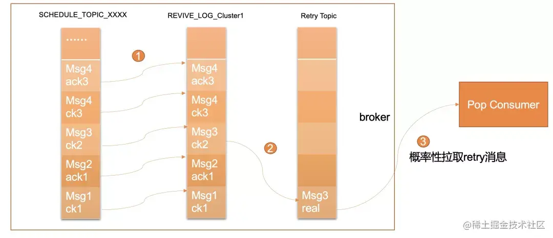 当 checkPoint 消息在 buffer 中等待一段时间,一直未等到 ack 消息时,checkPoint 信息会清理出 buffer 并发送 ck msg 到 store,ck msg 首先被发送到延时队列 SCHEDULE_Topic_XXXX 中,延时完成以后会进入 REVIVE_LOG Topic,REVIVE_LOG Topic 是保存在 store 当中待处理的 ck msg 和 ack msg 的 Topic,POPReceiveService 拉取 REVIVE_LOG Topic 的消息放到一个 map 当中,如果 ck 有对应的 ack 则会更新 REVIVE_LOG 的消费位点,标识消息消费完成,超时未被确认的 ck msg,会查询到 ck msg 对应的真实的消息,并把这个消息放到 retry Topic 当中,等待客户端消费,POP Consumer 正常消费的时候会概率性的消费到 retry Topic 中的消息。我们从这块设计中可以看到 RocketMQ 的常用设计,通过一些内部的 Topic 实现业务逻辑,事务消息,定时消息都用了这种设计方式。