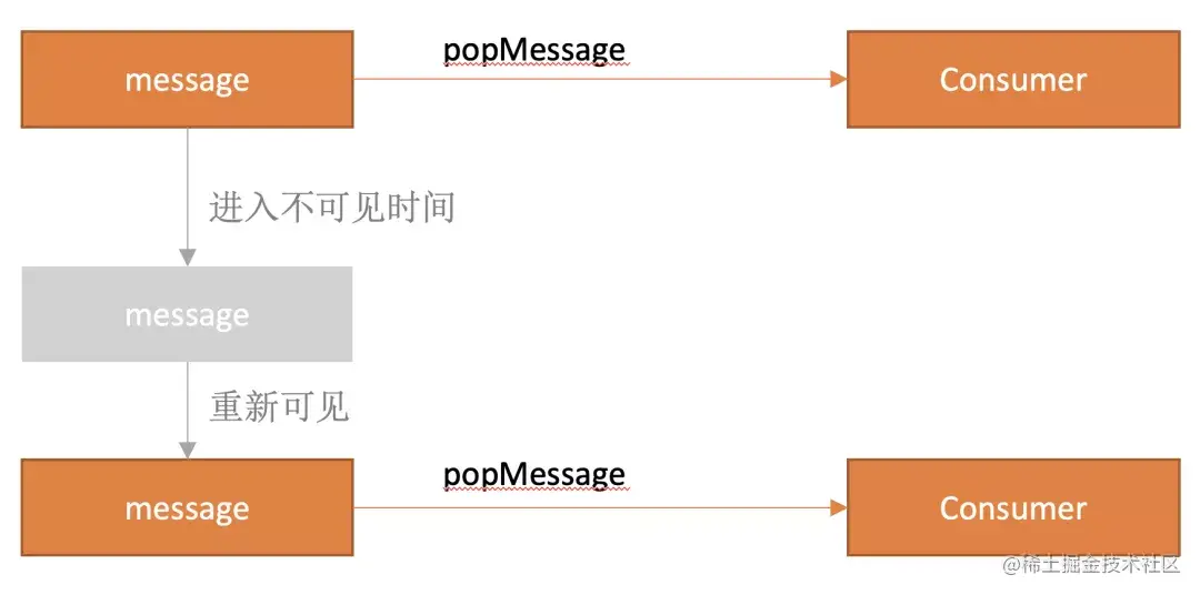 对于消息的重试,当 POP 出一条消息之后,这条消息就会进入一个不可见的时间,在这段时间就不会再被 POP 出来。如果没有在这段不可见时间通过 ackMessage 确认消息消费成功,那么过了不可见时间之后,这条消息就会再一次的可见。