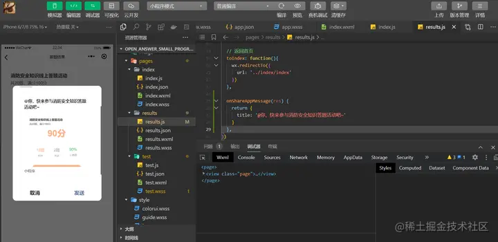 瞧,这不就实现了转发分享答题成绩功能了吗。就这么一小段代码,就轻松实现了答题小程序的转发分享功能。