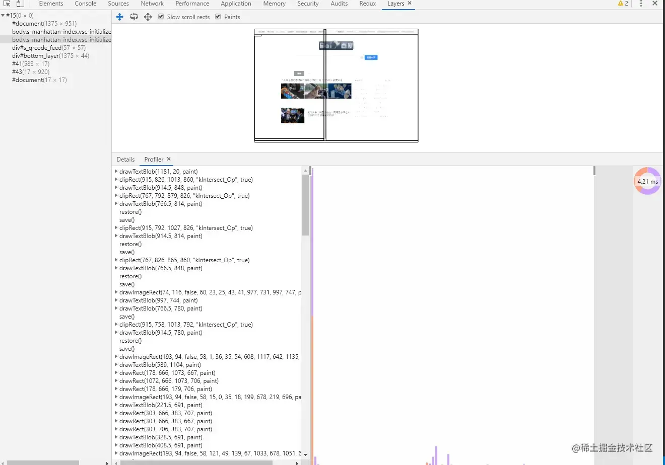 这里我以百度首页为例,大家可以在 Chrome 开发者工具中在设置栏中展开 more tools, 然后选择Layers面板,就能看到下面的绘制列表: