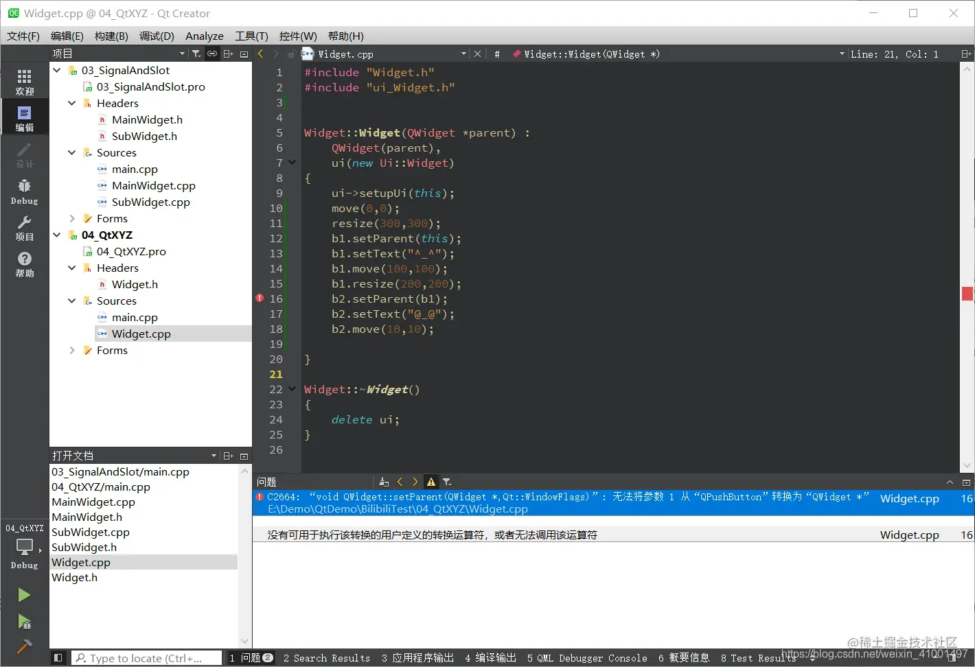 Qt学习(四)—— 坐标系统 hiyoritsai 2021-11-12 367 阅读1分钟 坐标系统 move()属于QWidget类,QWidget又是所有界面元素的基类,所以所有界面元素对象都可以使用move()。 对于父窗口(主窗口),坐标系统相对于屏幕,原点相对于屏幕左上角,x往右递增,y往下递增。 对于子窗口或者控件,坐标系统对象于父窗口,原点相对于父窗口的空白区域左上角(不包括边框)。 P.S:一开始我直接用setParent()将b1指定为b2的父元素,结果出现如下报错信息。