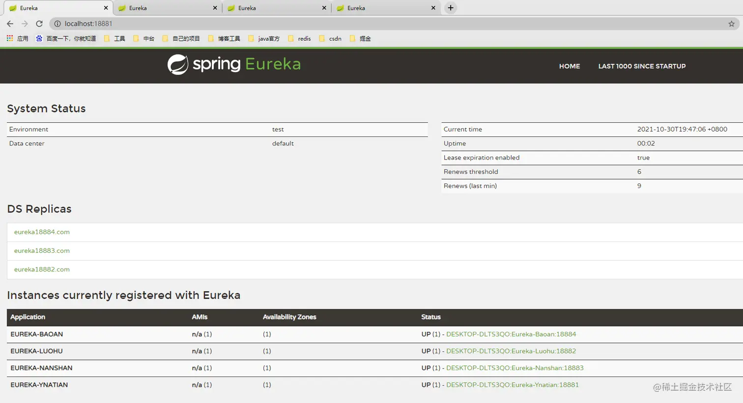 依次启动集群中四个Eureka Server服务,等待集群之间稳定后,访问Eureka Server的Dashboard,此时在四台Eureka Server中的任意一台都可以看到相同的服务注册信息Instance currently registered with Eureka,以及DS Replicaes信息(这个不相同哦,不需要复制自己……),此时说明Eureka Server Cluster已经正常启动了。