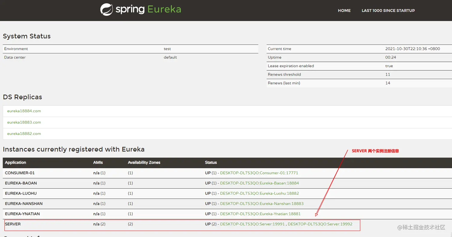 此时访问Eureka dashboard可以看到Server 有两个实例注册到了Eureka Server Cluster中。