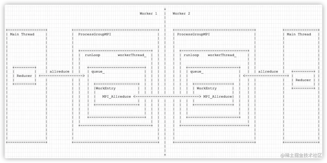 - 在 Main Thread 之中做训练,在 Reducer 之中做 allreduce,具体是往 ProcessGroupMPI 的 workerThread_ 发送指令。