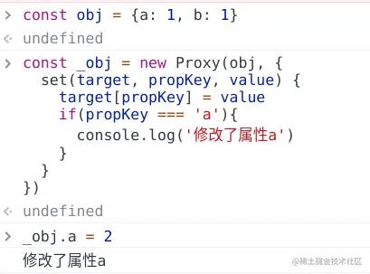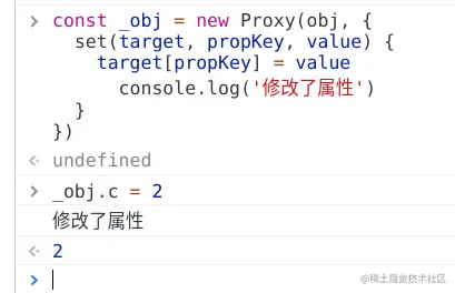 proxy是数组代理, 对obj的任何属性修改都会进入set方法,最大的特点就是对任何属性做监听,因为他不是对属性的拦截器。是对对象本身的代理