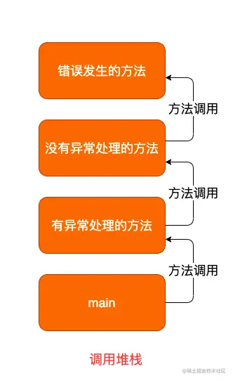 当方法抛出异常后,运行时系统会尝试找到处理异常的方法。首先系统会判断,错误发生的方法有没有处理,如果没有,会把异常往上层方法抛,直到找到有异常处理的方法。这样的话,从错误发生的方法到异常处理的方法之间,就会形成调用方法的有序列表。