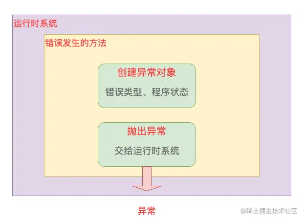 计算机程序运行会有个主入口,一般我们称为 main 方法,main 方法内部也可能调用各种其它方法。当某个方法发生错误时,这个方法就会创建一个对象,并把它移交给运行时的系统。这个对象就称为**异常对象 **,它包含了错误相关的信息,包括错误类型和程序状态。