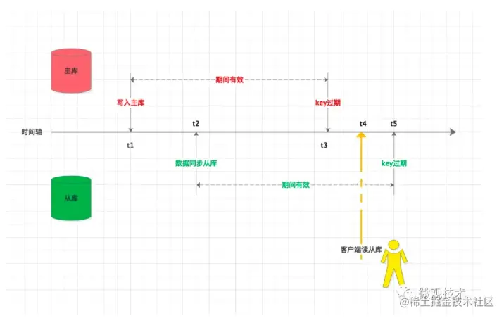 由于网络原因、或者缓存服务器的执行效率,从库的命令并没有立即执行。一直等到了 t2 才开始执行, 数据的有效期则会延后到 t5