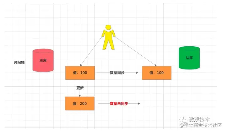 由于主从同步是异步进行的,有一定延迟,假如最新数据还没有同步到从库,那么从库读取的就不是最新值。