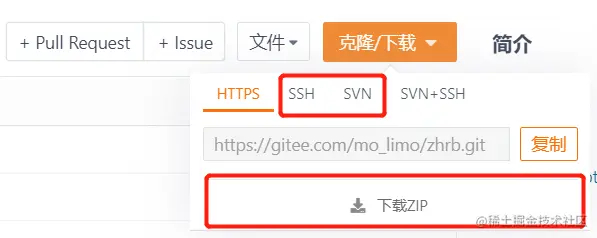 复制代码地址进入gitee,选择下载zip或直接用git、svn下载项目代码到本地。
