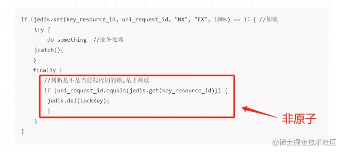 在这里,「判断是不是当前线程加的锁」和「释放锁」不是一个原子操作。如果调用jedis.del()释放锁的时候,可能这把锁已经不属于当前客户端,会解除他人加的锁。