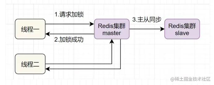 如果线程一在Redis的master节点上拿到了锁,但是加锁的key还没同步到slave节点。恰好这时,master节点发生故障,一个slave节点就会升级为master节点。线程二就可以获取同个key的锁啦,但线程一也已经拿到锁了,锁的安全性就没了。